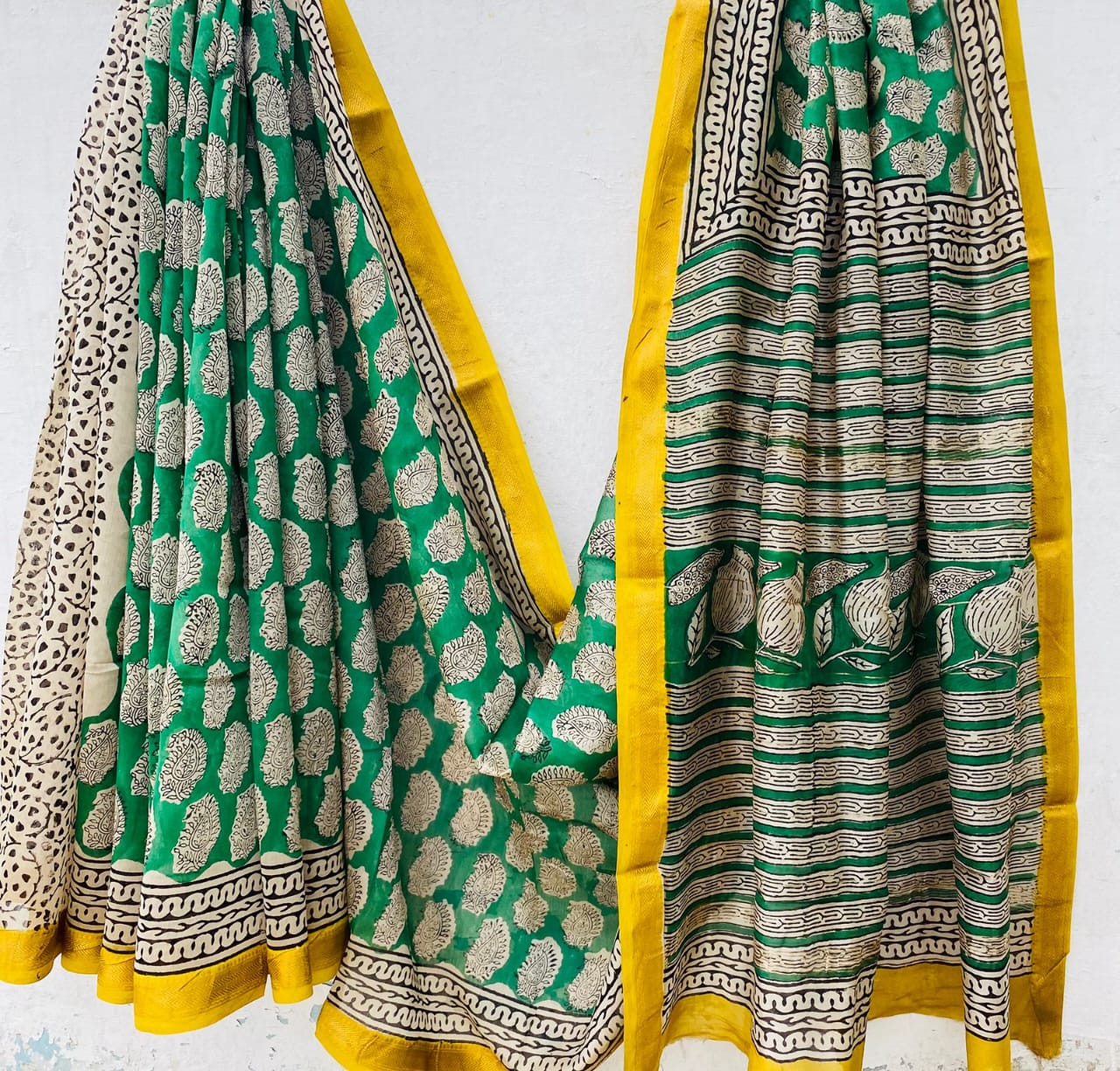 Royal Nizam Maheshwari Silk – Handblocked Harmony in Green & Mustard