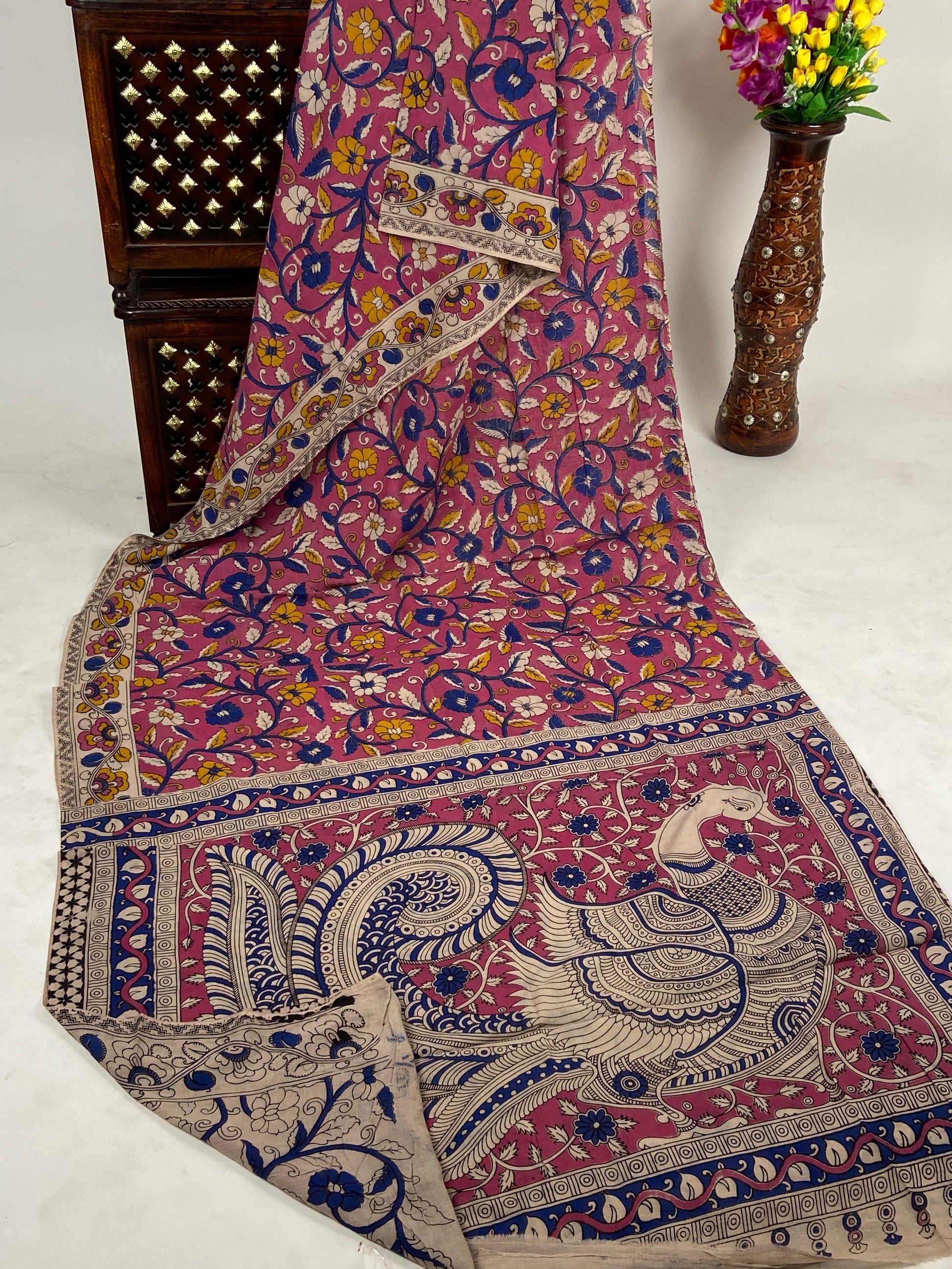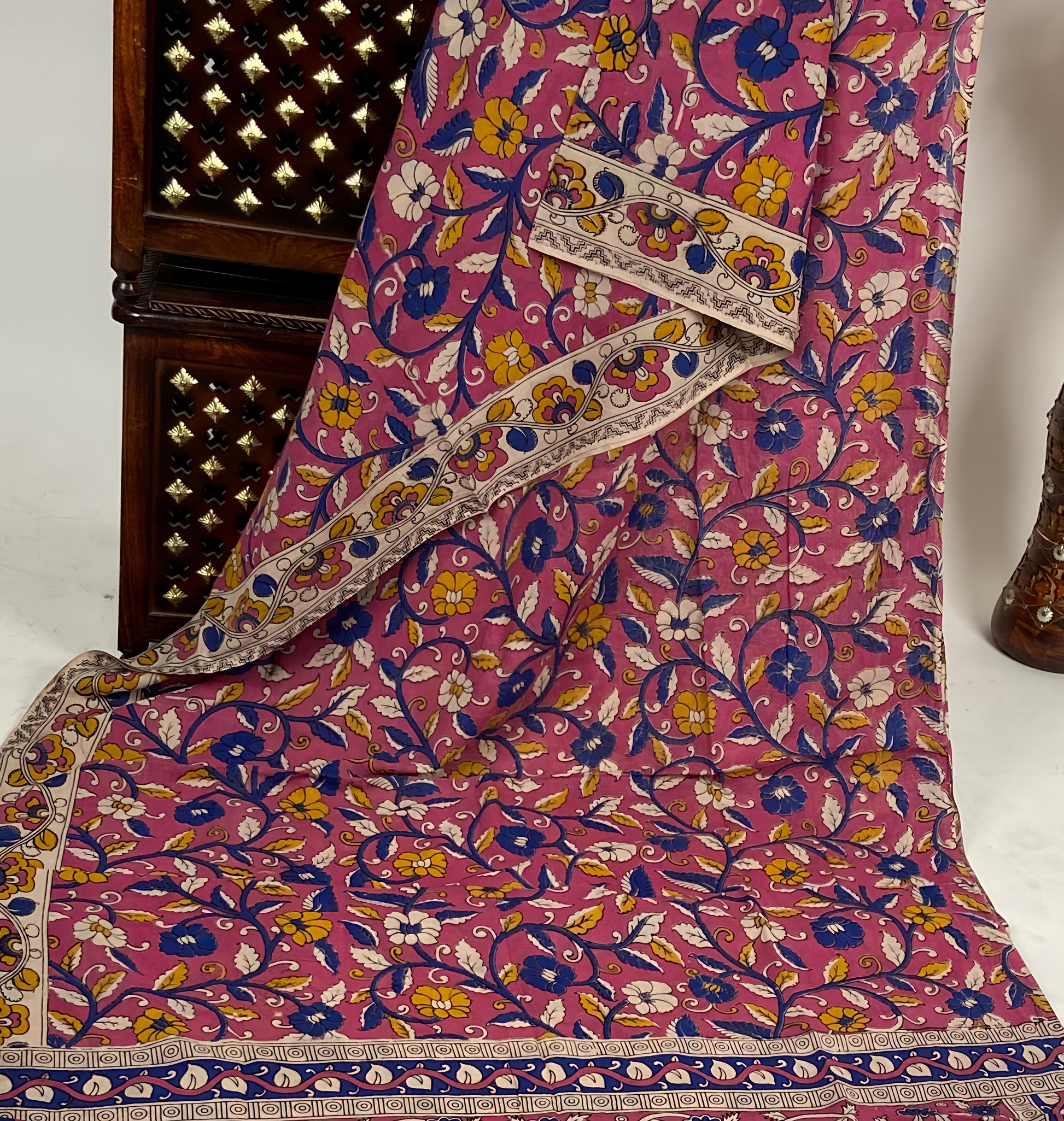 The saree is adorned with exquisite Kalamkari artwork, created using traditional hand-block or hand-painting techniques. Each motif — be it inspired by mythological stories, nature, or folk patterns — is brought to life using natural, plant-based dyes, showcasing the rich cultural legacy of Indian textile art.