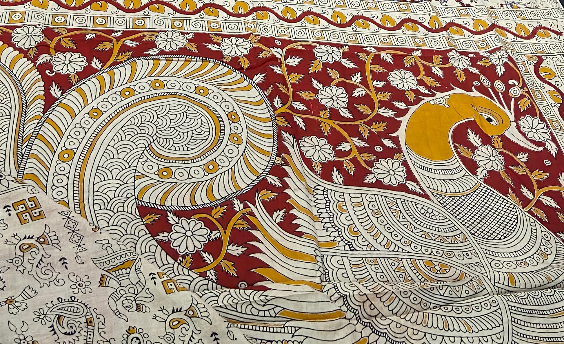 The saree is adorned with exquisite Kalamkari artwork, created using traditional hand-block or hand-painting techniques. Each motif — be it inspired by mythological stories, nature, or folk patterns — is brought to life using natural, plant-based dyes, showcasing the rich cultural legacy of Indian textile art.