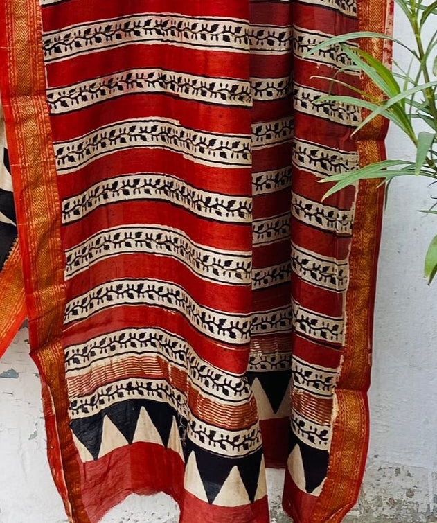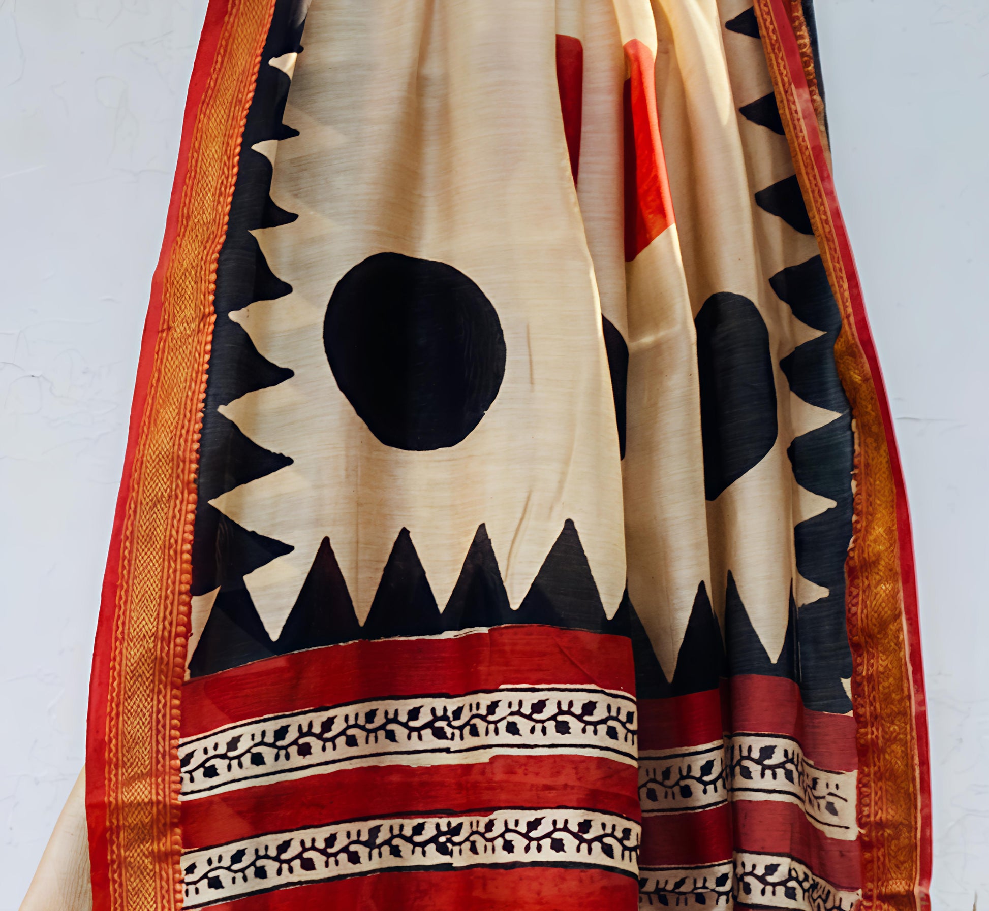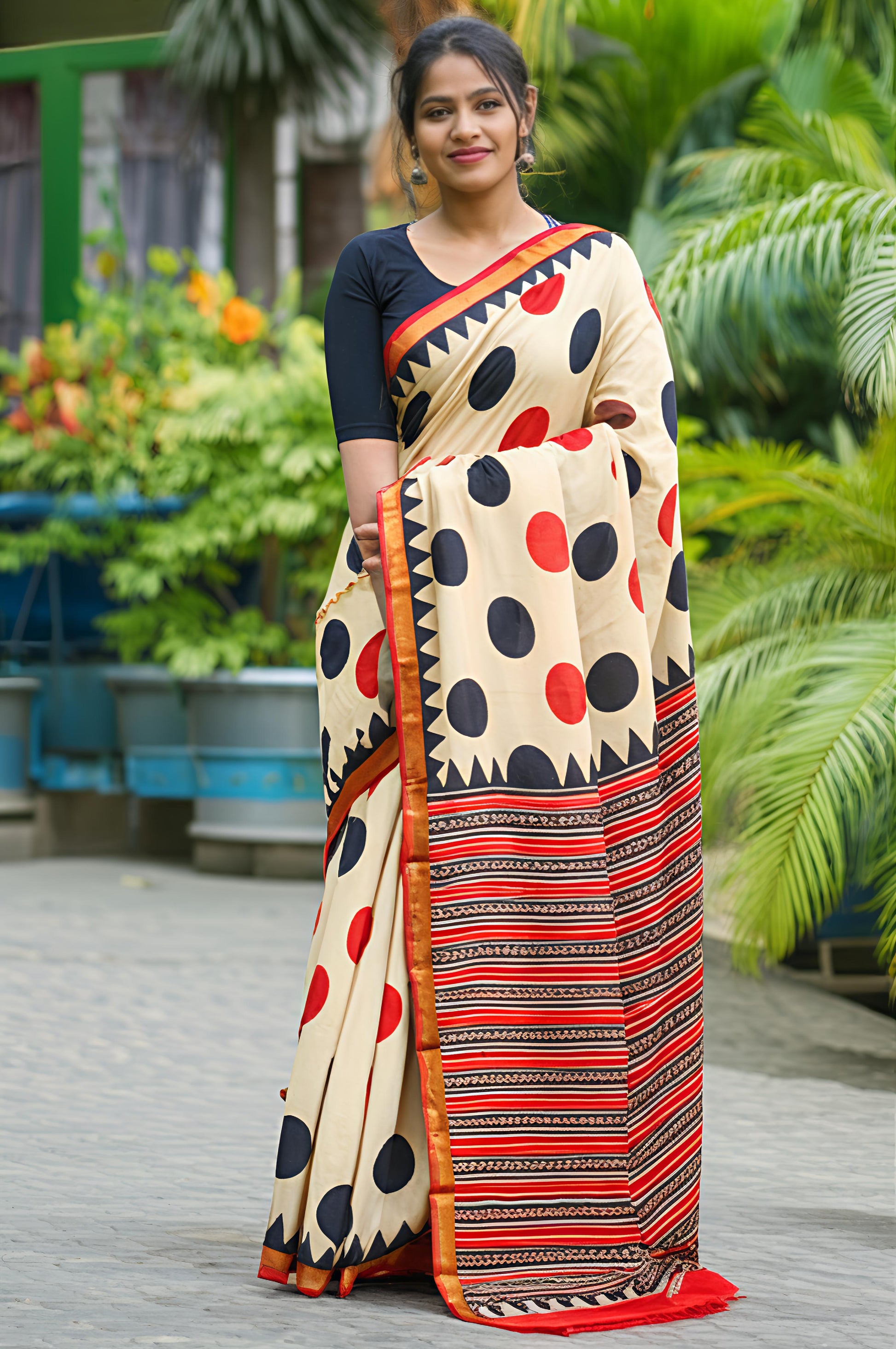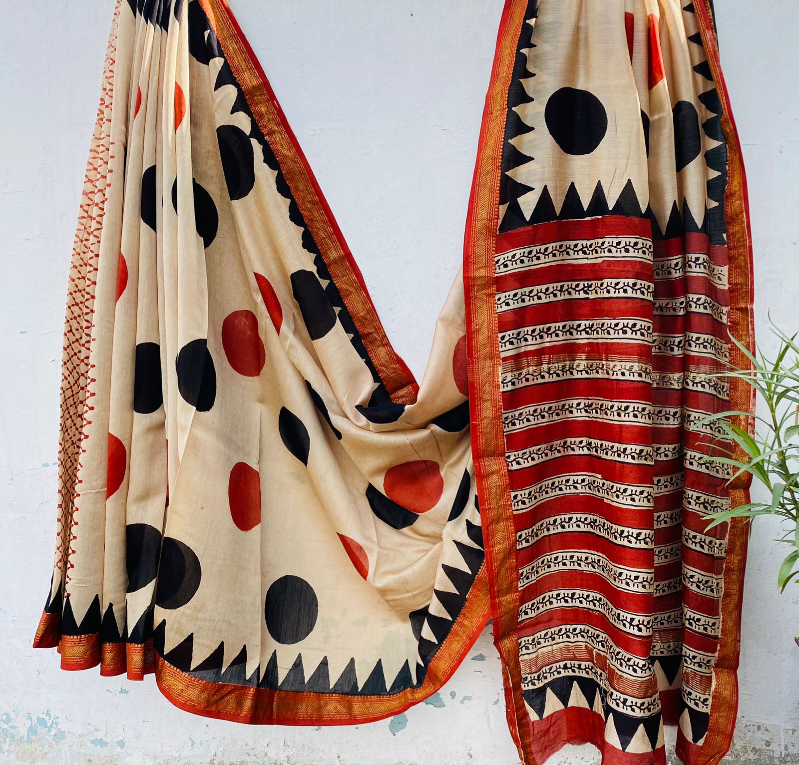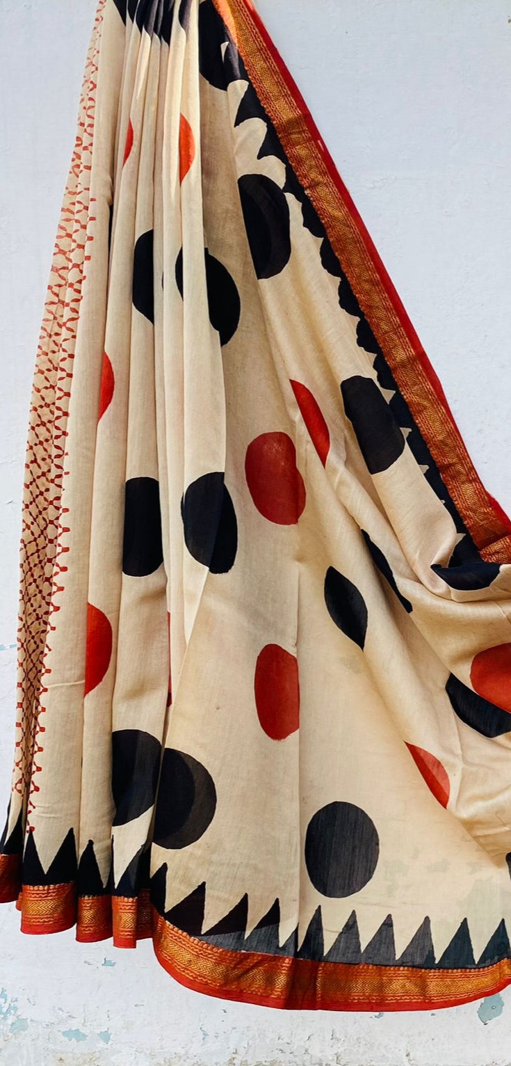 A celebration of contrast and craft, this handblocked Maheshwari saree features bold black and terracotta circles on a warm ivory base. The anchal stuns with tribal-inspired motifs and intricate red-black borders, exuding fierce elegance and heritage in every drape.