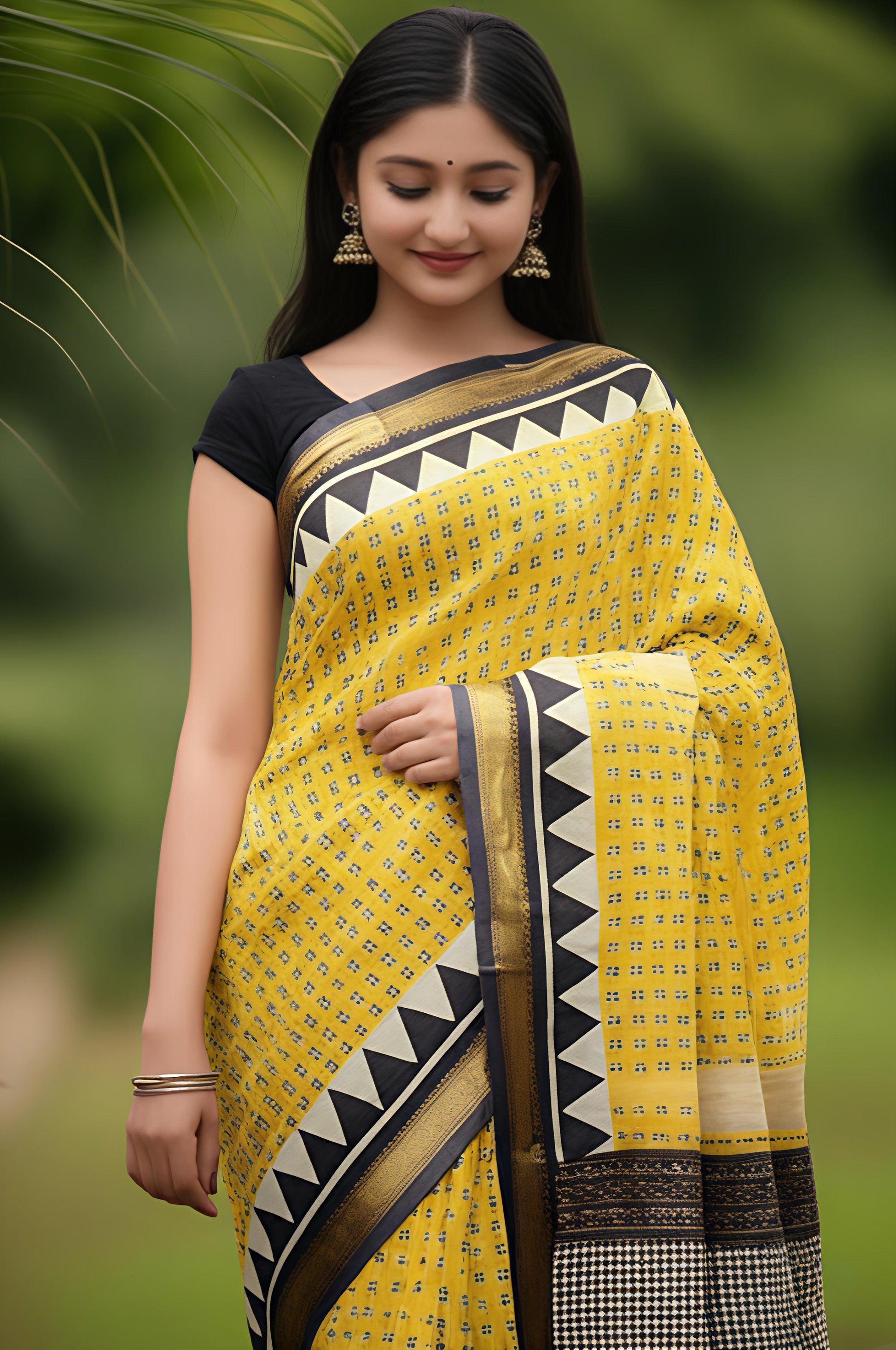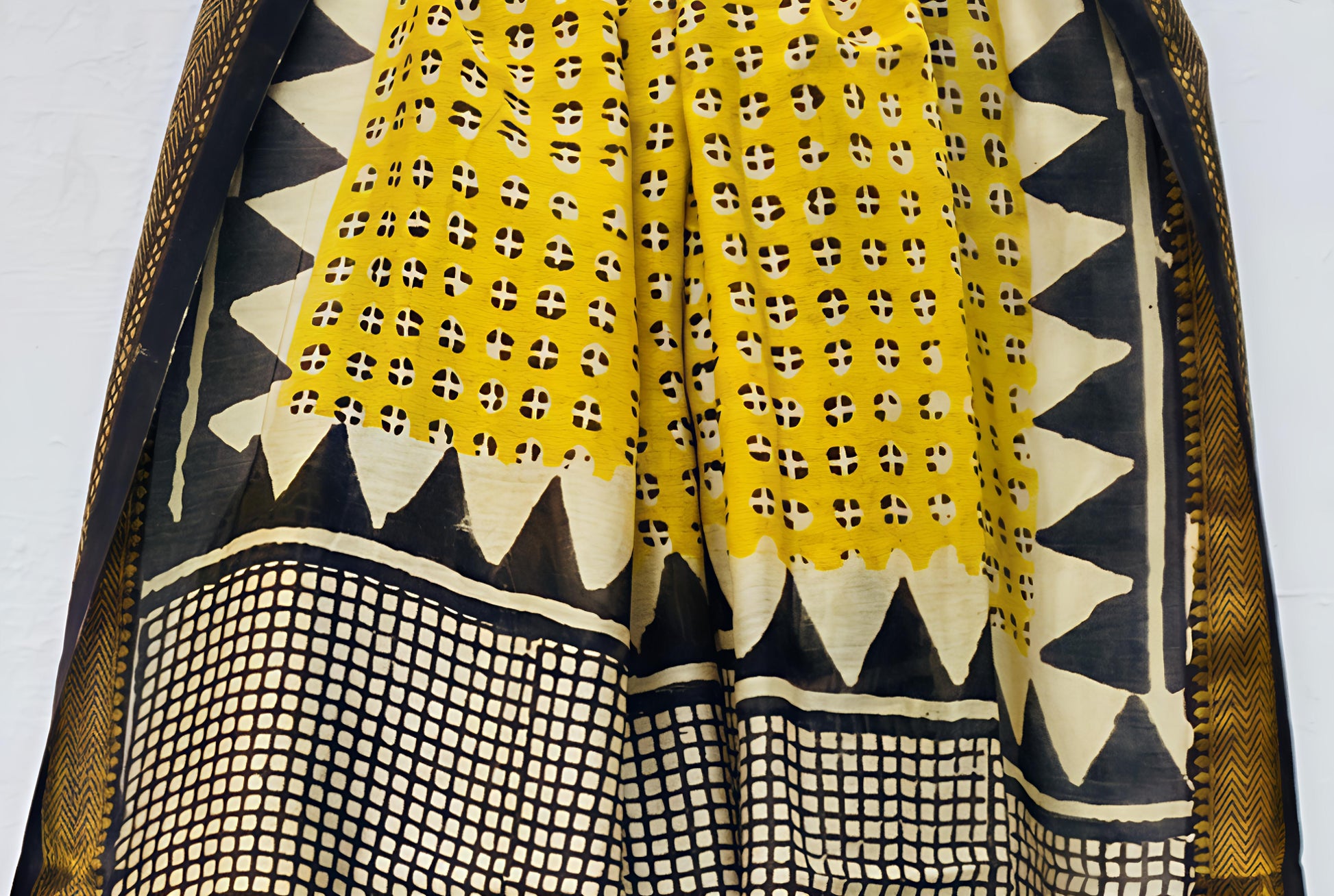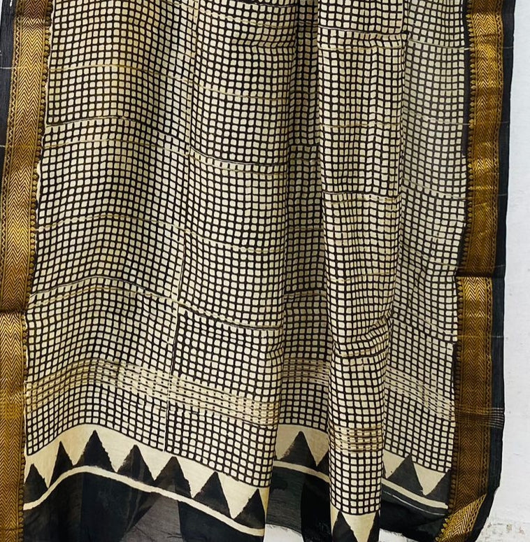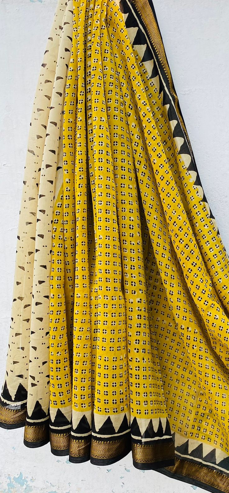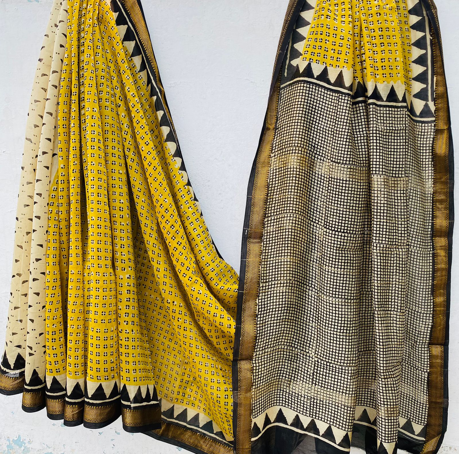 An ode to regal craftsmanship, this Royal Nizam Maheshwari Silk saree boasts intricate handblocked detailing in vibrant marigold yellow, classic ivory, and deep black. With bold geometric patterns and a rich traditional palette, it’s designed to make a graceful, powerful impression.